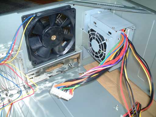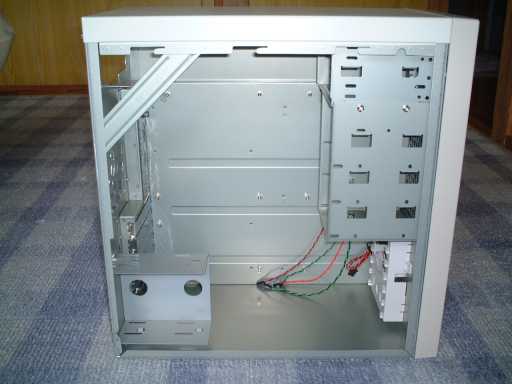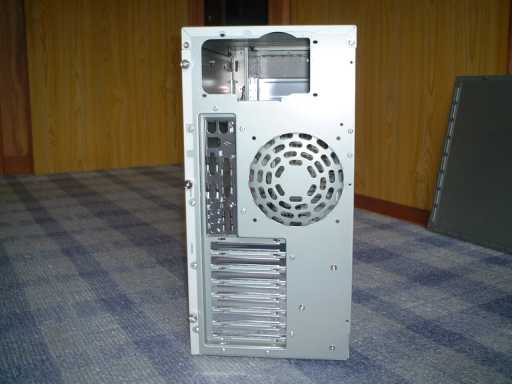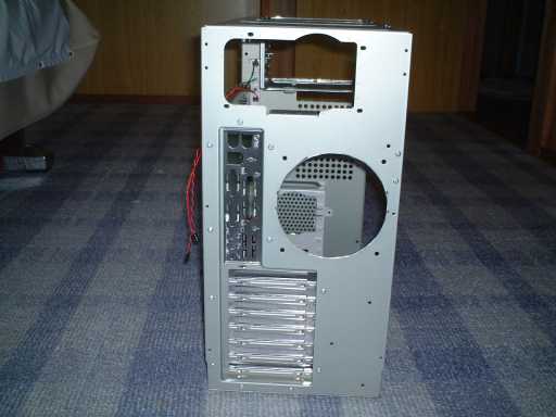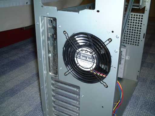 背面。大きな空冷ファンを付けるようになっています。でも、なるべく静かなマシンを作りたいと思っているので、この鉄板打ち抜きのフィンガーガード(ファンガード)は気になりますね。一応膨らみをつけて静かにしようという配慮は感じられますけれど、実際に実験してみると、結構風切り音がします。こんなものは、取っちゃいましょう。